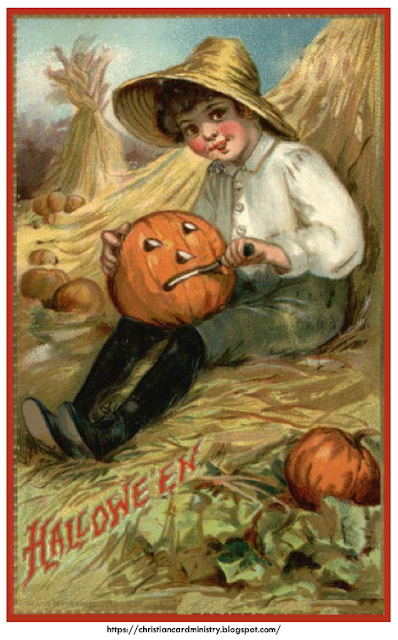 | This postcard is a very old illustration of a little girl wearing a Jack-O-Lantern larger than her head! The pumpkin decorated with a blue bonnet and red feather. |